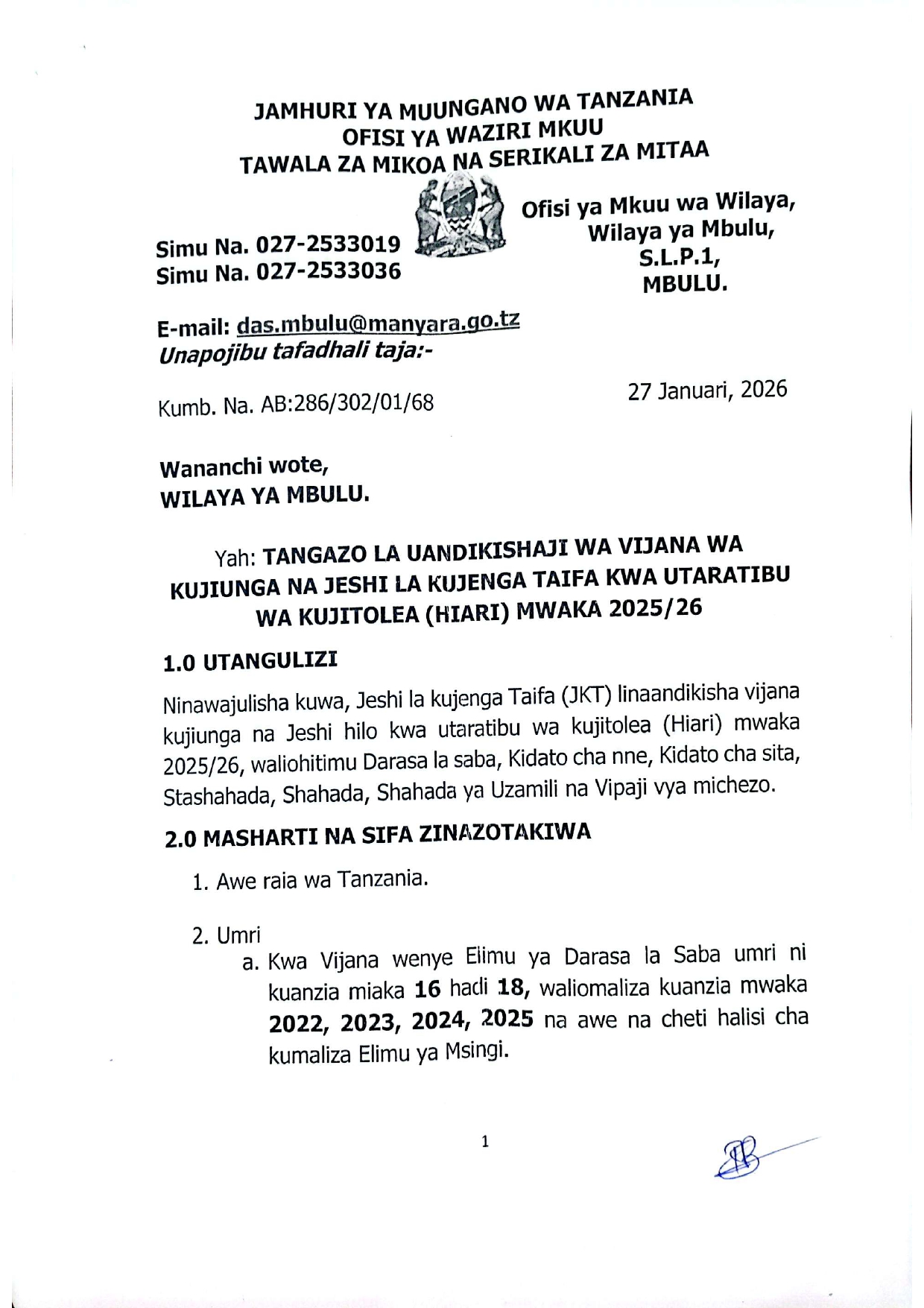 TANGAZO LA KUJIUNGA NA JESHI LA KUJENGA TAIFA (JKT) KWA HIARI