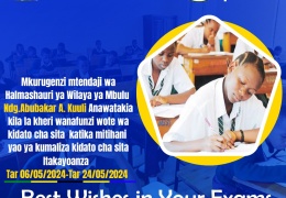 Mkurugenzi Mtendaji wa Halamshauri ya Wilaya ya Mbulu anawatakia kila lakheri wananfunzi wote wa kidato cha Sita wanaonza mitihani yao hii leo tarehe 6/5/2024 na kumaliza tarehe 24/05/2024.