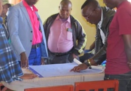 AFISA MIPANGO MIJI NA MRATIBU WA ANWANI ZA MAKAZI HALAMSHAURI YA WILAYA  BWN. KYARUZI  AKISOMA RAMANI KABLA YA KUANZA KAZI
