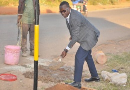 Ndugu Abubakari Kuuli Mkurugenzi Mtendaji wa Halmashauri ya Wilaya ya Mbulu akiweka udongo wakati wa usimikaji wa Nguzo za barabara